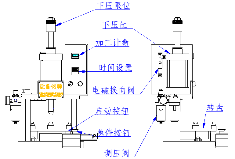 本機采用PLC集中控制,并可加裝紅外光柵保護,力傳感器(可以數字形式顯示了出壓力大小),行程測量傳感器(可以數字形式顯示了出氣缸下壓的距離數值),可實現超壓、超位報警和回程。也可根據實際情況而